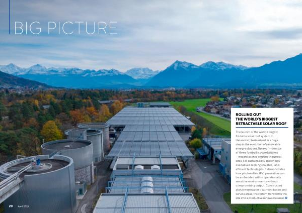 The launch of the world’ s largest foldable solar roof system in Uetendorf, Switzerland, is a huge step in the evolution of renewable energy solutions. The roof – the size of three football( soccer) pitches – integrates into existing industrial sites. For sustainability and energy executives seeking scalable, landefficient technologies, it demonstrates how photovoltaic( PV) generation can be embedded within operationally sensitive environments without compromising output. Constructed above wastewater treatment basins and service areas, the system transforms the site into a productive renewable asset.