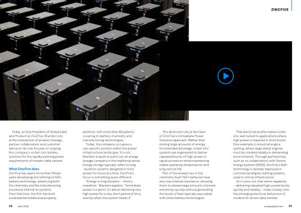 That electrical profile makes nickelzinc well suited to applications where high power is required in short bursts. One example is industrial engine starting, where large diesel engines must be cranked reliably in demanding environments. Through partnerships such as its collaboration with Stored Energy Systems( SENS), ZincFive’ s NiZn technology is already deployed in commercial engine-starting systems used in critical infrastructure.