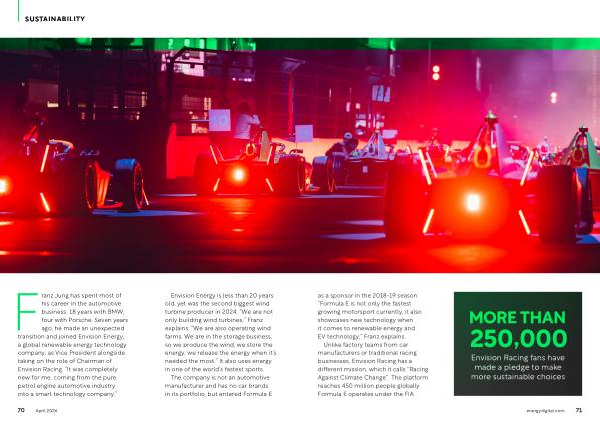 Envision Energy is less than 20 years old, yet was the second biggest wind turbine producer in 2024.“ We are not only building wind turbines,” Franz explains.“ We are also operating wind farms. We are in the storage business, so we produce the wind, we store the energy, we release the energy when it’ s needed the most.” It also uses energy in one of the world’ s fastest sports.