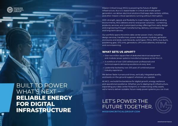 Mission Critical Group( MCG) is powering the future of digital infrastructure. As a U. S.-based leader in critical and onsite power generation, we deliver electrical solutions that keep data centers, utilities, and other mission critical operations running without interruption.
