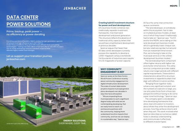 Creating hybrid investment structure for power and land development E3’ s business model combines two traditionally separate investment frameworks: merchant land development and power generation. This structure reflects the absence of traditional utility capacity letters that would have simplified land development in previous decades.