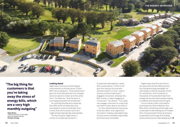 THE ENERGY INTERVIEW to lead with affordability, rather than sustainability.“ I think in the past the industry has led with decarbonisation or zero-carbon homes and that really hasn’ t engaged consumers, whereas Zero Bills homes is really engaging to consumers,” he reflects.“ You really can engage customers in a way that we haven’ t been able to do before.”