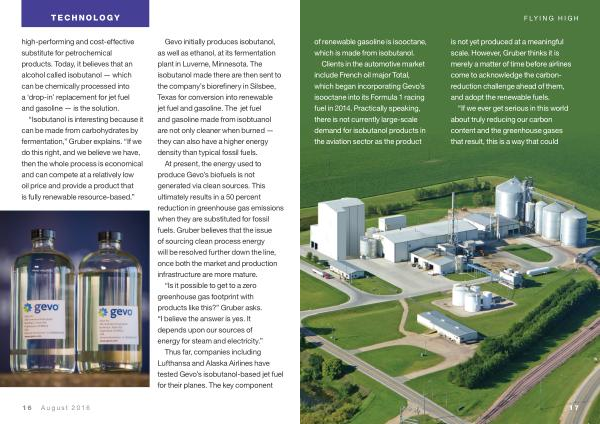 Clients in the automotive market include French oil major Total , which began incorporating Gevo ’ s isooctane into its Formula 1 racing fuel in 2014 . Practically speaking , there is not currently large-scale demand for isobutanol products in the aviation sector as the product is not yet produced at a meaningful scale . However , Gruber thinks it is merely a matter of time before airlines come to acknowledge the carbonreduction challenge ahead of them , and adopt the renewable fuels .