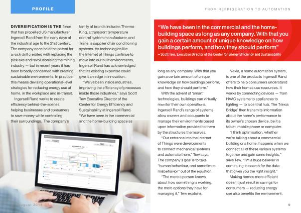 DIVERSIFICATION IS THE force that has propelled US manufacturer Ingersoll Rand from the early days of the industrial age to the 21st century . The company once held the patent for a rock drill credited with replacing the pick axe and revolutionising the mining industry — but in recent years it has been broadly concerned with creating sustainable environments . In practice , this means devising operational-level strategies for reducing energy use at home , in the workplace and in-transit .