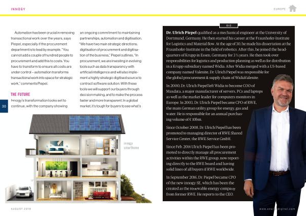 Innogy ’ s transformation looks set to continue , with the company showing an ongoing commitment to maintaining partnerships , automation and digitisation . “ We have two main strategic directions : digitisation of procurement and digitisation of the business ,” Piepel outlines . “ In procurement , we are investing in evolving tools such as data transparency with artificial intelligence and will also implement a highly strategic digitised source to contract software solution . With these tools we will support our buyers through decision making , and to make the process faster and more transparent . In a global market , it ’ s tough for buyers to see what ’ s