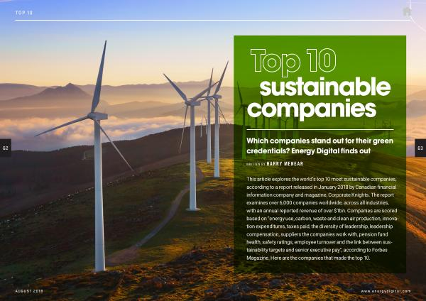 This article explores the world ’ s top 10 most sustainable companies , according to a report released in January 2018 by Canadian financial information company and magazine , Corporate Knights . The report examines over 6,000 companies worldwide , across all industries , with an annual reported revenue of over $ 1bn . Companies are scored based on “ energy use , carbon , waste and clean air production , innovation expenditures , taxes paid , the diversity of leadership , leadership compensation , suppliers the companies work with , pension fund health , safety ratings , employee turnover and the link between sustainability targets and senior executive pay ”, according to Forbes Magazine . Here are the companies that made the top 10 .