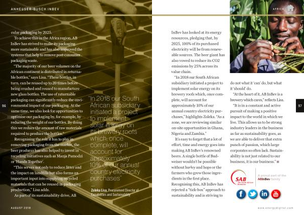 InBev has looked at its energy resources , pledging that , by 2025 , 100 % of its purchased electricity will be from renewable sources . The beer giant has also vowed to reduce its CO2 emissions by 25 % across its value chain . “ In 2018 our South African subsidiary initiated a project to implement solar energy on its brewery roofs which , once complete , will account for approximately 10 % of our annual country electricity purchases ,” highlights Zoleka . “ As a zone , we are reviewing similar on-site opportunities in Ghana , Nigeria and Zambia .”