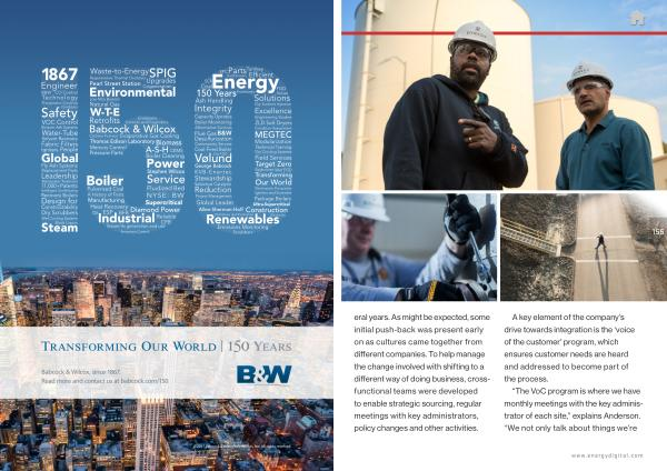 © 2017 Babcock & Wilcox Enterprises , Inc . All rights reserved . Babcock & Wilcox , since 1867 . Read more and contact us at babcock . com / 150 Power Emissions Distillation and Purification Precipitator Controls Design for Constructability Steam / its generation and use Evaporative Gas Cooling Regenerative Thermal Oxidizers Heat Recovery Solvent Recovery Black Liquor Emissions Monitoring Babcock & Wilcox Reliable Efficient Turnkey KVB-Enertec Sootblowers Upgrades A History of Firsts Retrofits Pressure Parts Pulverizers Excellence Bottom Ash Systems Recovery Boilers Leadership Emissions Control Mercury Control Low NO X Burners Biomass Oil Pulverized Coal Waste-to-Energy Wet Cooling Systems Parts Replacement Parts Engineer Natural Gas Water-Tube Coal Scrubbers Global Leader Package Boilers Igniters and Scanners Intelligent Sootblowing Community Service Technical Training Modularization People CO Control Stewardship Condition Assessment Project Management Engineering Studies Wastewater Treatment Fly Ash Systems Transforming Our World Baghouses Wet FGD Dry Cooling Systems Aftermarket Services Dry Scrubbers Technology Boiler Monitoring Field Services NYSE : BW B & W B & W Electrostatic Precipitator Dry Sorbent Injection Controls and Diagnostics CEMS Refuse Service Boiler Cleaning Coal-Fired Boiler Capacity Uprates Fabric Filters Flue Gas Desulfurization Selective Catalytic Reduction Ash Handling Solutions Dry FGD FGD ZLD Salt Dryers Integrity Electricity Oxidizers VOC Control Cyclone Furnace Fluidized Bed EPC ESP Global Safety BFB CFB Igniters Manufacturing SCR 11,000 + Patents Cogeneration Thomas Edison Laboratory Construction Target Zero 150 Years Vølund George Babcock Stephen Wilcox MEGTEC Diamond Power A-S-H Allen-Sherman-Hoff W-T-E SPIG Pearl Street Station 1867 Steam Boiler Energy Environmental Supercritical Ultra-Supercritical Renewables Industrial