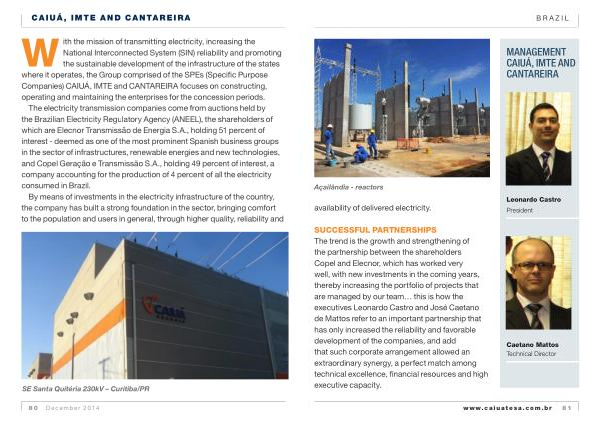 SUCCessFUL PARtneRSHIps The trend is the growth and strengthening of the partnership between the shareholders Copel and Elecnor , which has worked very well , with new investments in the coming years , thereby increasing the portfolio of projects that are managed by our team … this is how the executives Leonardo Castro and José Caetano de Mattos refer to an important partnership that has only increased the reliability and favorable development of the companies , and add that such corporate arrangement allowed an extraordinary synergy , a perfect match among technical excellence , financial resources and high executive capacity .