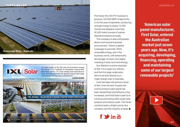 ‘ American solar panel manufacturer , First Solar , entered the Australian market just seven years ago . Now , it ’ s acquiring , developing , financing , operating and maintaining some of our largest renewable projects ’ 53
