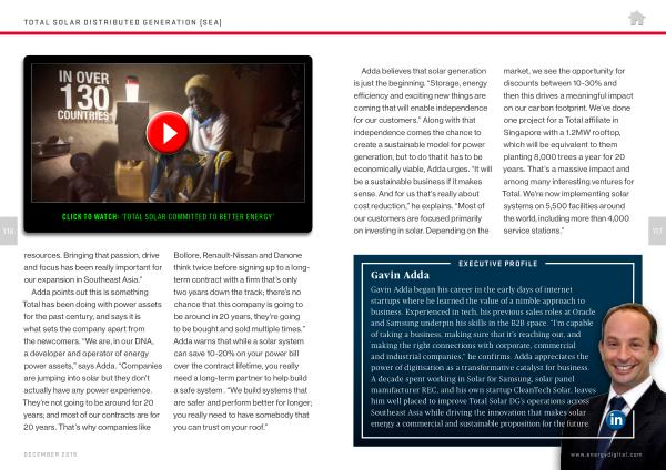 Adda believes that solar generation is just the beginning . “ Storage , energy efficiency and exciting new things are coming that will enable independence for our customers .” Along with that independence comes the chance to create a sustainable model for power generation , but to do that it has to be economically viable , Adda urges . “ It will be a sustainable business if it makes sense . And for us that ’ s really about cost reduction ,” he explains . “ Most of our customers are focused primarily on investing in solar . Depending on the market , we see the opportunity for discounts between 10-30 % and then this drives a meaningful impact on our carbon footprint . We ’ ve done one project for a Total affiliate in Singapore with a 1.2MW rooftop , which will be equivalent to them planting 8,000 trees a year for 20 years . That ’ s a massive impact and among many interesting ventures for Total . We ’ re now implementing solar systems on 5,500 facilities around the world , including more than 4,000 service stations .”