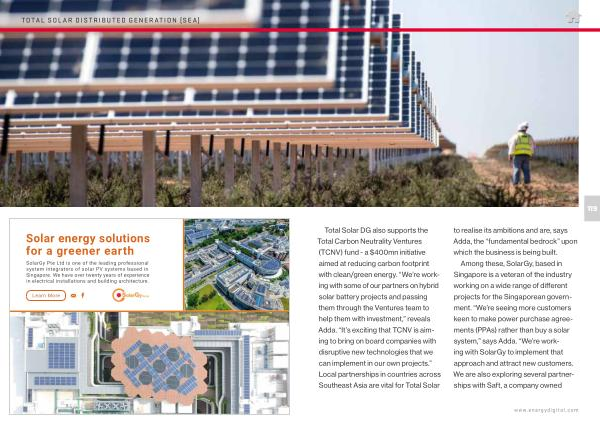 Total Solar DG also supports the Total Carbon Neutrality Ventures ( TCNV ) fund - a $ 400mn initiative aimed at reducing carbon footprint with clean / green energy . “ We ’ re working with some of our partners on hybrid solar battery projects and passing them through the Ventures team to help them with investment ,” reveals Adda . “ It ’ s exciting that TCNV is aiming to bring on board companies with disruptive new technologies that we can implement in our own projects .” Local partnerships in countries across Southeast Asia are vital for Total Solar to realise its ambitions and are , says Adda , the “ fundamental bedrock ” upon which the business is being built .