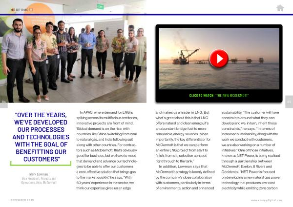 CLICK TO WATCH : ‘ THE NEW MCDERMOTT ’ 85 and makes us a leader in LNG . But what ’ s great about this is that LNG offers natural and clean energy ; it ’ s an abundant bridge fuel to more renewable energy sources . Most importantly , the key differentiator for McDermott is that we can perform an entire LNG project from start to finish , from site selection concept right through to the tank .”