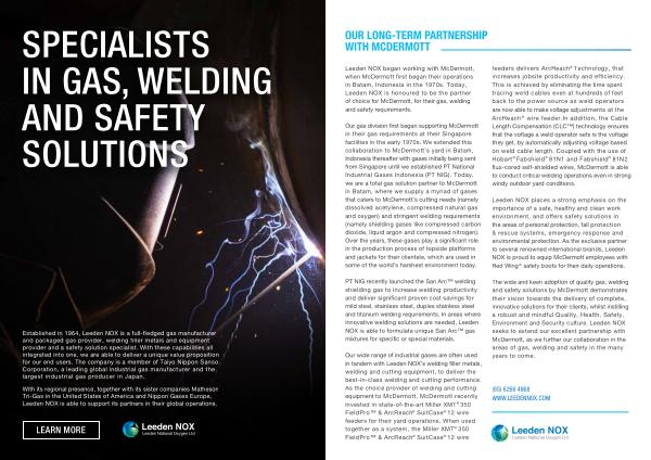 Our gas division first began supporting McDermott in their gas requirements at their Singapore facilities in the early 1970s . We extended this collaboration to McDermott ’ s yard in Batam , Indonesia thereafter with gases initially being sent from Singapore until we established PT National Industrial Gases Indonesia ( PT NIG ). Today , we are a total gas solution partner to McDermott in Batam , where we supply a myriad of gases that caters to McDermott ’ s cutting needs ( namely dissolved acetylene , compressed natural gas and oxygen ) and stringent welding requirements ( namely shielding gases like compressed carbon dioxide , liquid argon and compressed nitrogen ). Over the years , these gases play a significant role in the production process of topside platforms and jackets for their clientele , which are used in some of the world ’ s harshest environment today . feeders delivers ArcReach Technology , that increases jobsite productivity and efficiency . This is achieved by eliminating the time spent tracing weld cables even at hundreds of feet back to the power source as weld operators are now able to make voltage adjustments at the ArcReach wire feeder . In addition , the Cable Length Compensation ( CLC™ ) technology ensures that the voltage a weld operator sets is the voltage they get , by automatically adjusting voltage based on weld cable length . Coupled with the use of Hobart Fabshield 81N1 and Fabshield 81N2 flux-cored self-shielded wires , McDermott is able to conduct critical welding operations even in strong windy outdoor yard conditions .