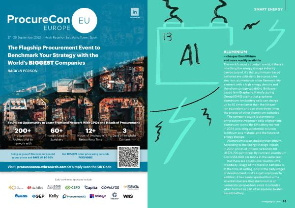– cheaper than lithium and more readily available The world ’ s most abundant metal , if there ’ s one thing the energy storage industry can be sure of , it ’ s that aluminium-based batteries are unlikely to be scarce . Like zinc-ion , aluminium is a low flammability element with a high energy density and therefore storage capability . Brisbanebased firm Graphene Manufacturing Group ( GMG ) claims that graphene aluminium-ion battery cells can charge up to 60 times faster than the lithiumion equivalent and can store three times the energy of other aluminium batteries . The company says it is planning to bring automotive pouch cells of graphene aluminium-ion to the EV battery market in 2024 , providing a potential solution to lithium as a material and the future of energy storage .