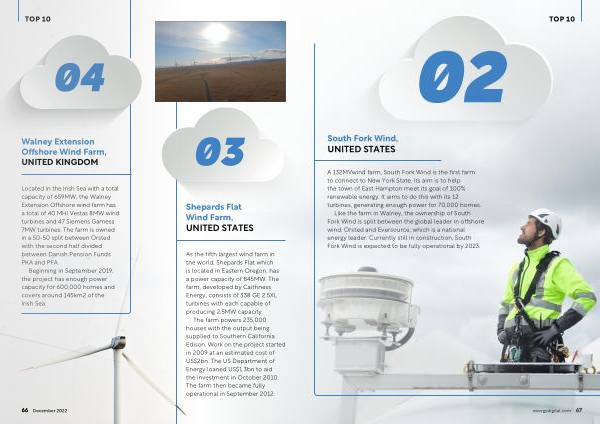 A 132MVwind farm , South Fork Wind is the first farm to connect to New York State . Its aim is to help the town of East Hampton meet its goal of 100 % renewable energy . It aims to do this with its 12 turbines , generating enough power for 70,000 homes . Like the farm in Walney , the ownership of South Fork Wind is split between the global leader in offshore wind , Orsted and Eversource , which is a national energy leader . Currently still in construction , South Fork Wind is expected to be fully operational by 2023 . energydigital . com 67
