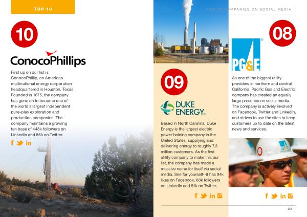 Based in North Carolina , Duke Energy is the largest electric power holding company in the United States , supplying and delivering energy to roughly 7.3 million customers . As the first utility company to make this our list , the company has made a massive name for itself via social media . See for yourself--it has 94k likes on Facebook , 88k followers on LinkedIn and 51k on Twitter .