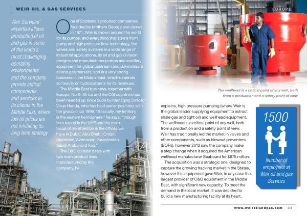 One of Scotland ’ s proudest companies , founded by brothers George and James in 1871 , Weir is known around the world for its pumps , and everything that stems from pump and high pressure flow technology , like valves and safety systems in a wide range of industrial applications . Its oil and gas division designs and manufactures pumps and ancillary equipment for global upstream and downstream oil and gas markets , and is a very strong business in the Middle East , which depends so heavily on hydrocarbons for its revenues .