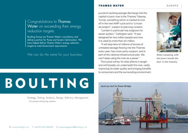 Boulting Group are Thames Water ’ s consultancy and delivery partner for Pump and System Optimisation . We have helped deliver Thames Water ’ s energy reduction targets to meet Government requirements .