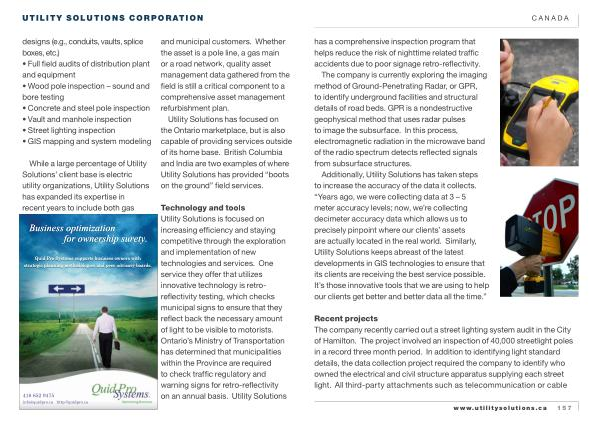 Technology and tools Utility Solutions is focused on increasing efficiency and staying competitive through the exploration and implementation of new technologies and services . One service they offer that utilizes innovative technology is retroreflectivity testing , which checks municipal signs to ensure that they reflect back the necessary amount of light to be visible to motorists . Ontario ’ s Ministry of Transportation has determined that municipalities within the Province are required to check traffic regulatory and warning signs for retro-reflectivity on an annual basis . Utility Solutions