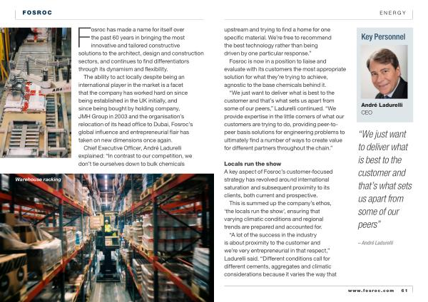 The ability to act locally despite being an international player in the market is a facet that the company has worked hard on since being established in the UK initially , and since being bought by holding company , JMH Group in 2003 and the organisation ’ s relocation of its head office to Dubai , Fosroc ’ s global influence and entrepreneurial flair has taken on new dimensions once again .