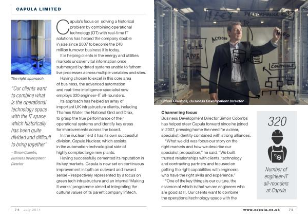 Capula ’ s focus on solving a historical problem by combining operational technology ( OT ) with real-time IT solutions has helped the company double in size since 2007 to become the £ 40 million turnover business it is today .