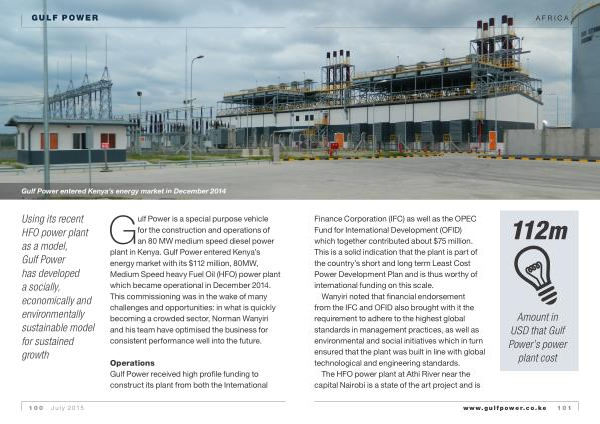 Gulf Power is a special purpose vehicle for the construction and operations of an 80 MW medium speed diesel power plant in Kenya . Gulf Power entered Kenya ’ s energy market with its $ 112 million , 80MW , Medium Speed heavy Fuel Oil ( HFO ) power plant which became operational in December 2014 . This commissioning was in the wake of many challenges and opportunities : in what is quickly becoming a crowded sector , Norman Wanyiri and his team have optimised the business for consistent performance well into the future .