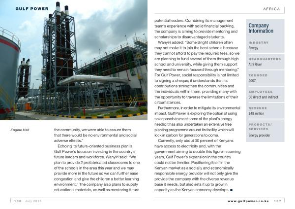 Echoing its future-oriented business plan is Gulf Power ’ s focus on investing in the country ’ s future leaders and workforce . Wanyiri said : “ We plan to provide 2 prefabricated classrooms to one of the schools in the area this year and we may provide more in the future so we can further ease congestion and give the children a better learning environment .” The company also plans to supply educational materials , as well as mentoring future