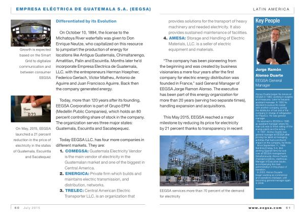 “ The company has been pioneering from the beginning and was created by business visionaries a mere four years after the first company for electric energy distribution was founded in France ,” said General Manager of EEGSA Jorge Ramon Alonso . The executive has been part of this energy organization for more than 20 years ( serving two separate times ), handling expansion and acquisitions .