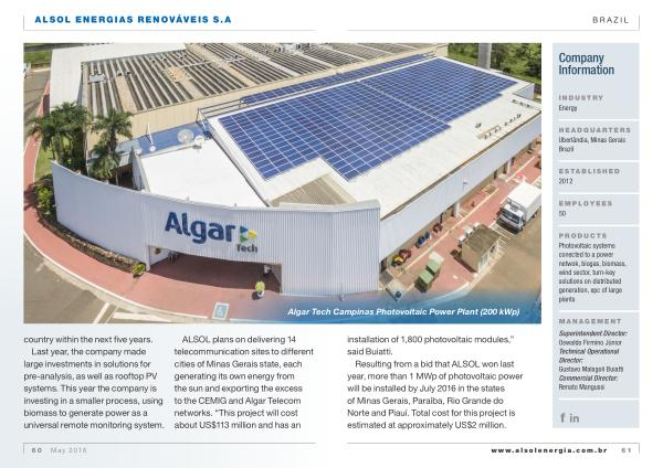 Resulting from a bid that ALSOL won last year , more than 1 MWp of photovoltaic power will be installed by July 2016 in the states of Minas Gerais , Paraíba , Rio Grande do Norte and Piauí . Total cost for this project is estimated at approximately US $ 2 million .