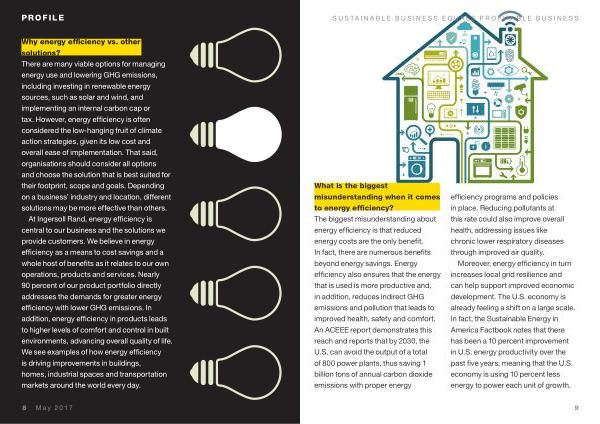 At Ingersoll Rand , energy efficiency is central to our business and the solutions we provide customers . We believe in energy efficiency as a means to cost savings and a whole host of benefits as it relates to our own operations , products and services . Nearly 90 percent of our product portfolio directly addresses the demands for greater energy efficiency with lower GHG emissions . In addition , energy efficiency in products leads to higher levels of comfort and control in built environments , advancing overall quality of life . We see examples of how energy efficiency is driving improvements in buildings , homes , industrial spaces and transportation markets around the world every day .