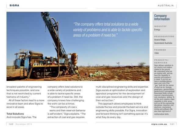 1994 multi-disciplined engineering skills and expertise . Sigra excels at optimization of exploration and appraisal programs for the development of coal and gas resources and the design of their extraction .”