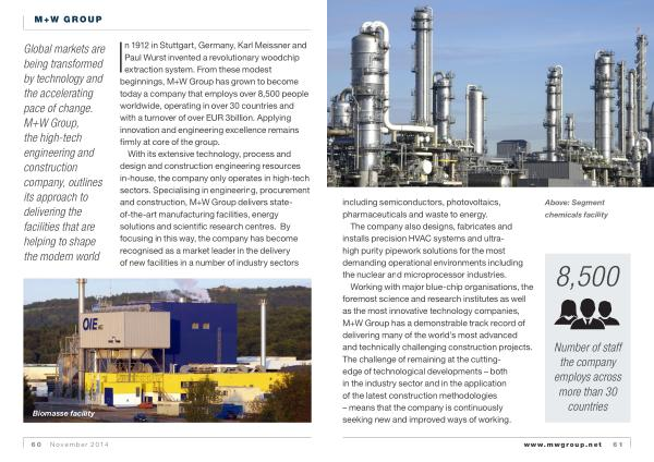 In 1912 in Stuttgart , Germany , Karl Meissner and Paul Wurst invented a revolutionary woodchip extraction system . From these modest beginnings , M + W Group has grown to become today a company that employs over 8,500 people worldwide , operating in over 30 countries and with a turnover of over EUR 3billion . Applying innovation and engineering excellence remains firmly at core of the group . With its extensive technology , process and design and construction engineering resources in-house , the company only operates in high-tech sectors . Specialising in engineering , procurement and construction , M + W Group delivers stateof-the-art manufacturing facilities , energy solutions and scientific research centres . By focusing in this way , the company has become recognised as a market leader in the delivery of new facilities in a number of industry sectors