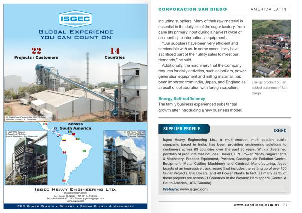 Isgec Heavy Engineering Ltd ., a multi-product , multi-location public company , based in India , has been providing engineering solutions to customers across 83 countries over the past 80 years . With a diversified portfolio of products that includes , Boilers , EPC Power Plants , Sugar Plants & Machinery , Process Equipment , Presses , Castings , Air Pollution Control Equipment , Metal Cutting Machinery and Contract Manufacturing , Isgec boasts of an impressive track record that includes the setting up of over 100 Sugar Projects , 650 Boilers , and 40 Power Plants . In fact , as many as 35 of these projects are across 21 Countries in the Western Hemisphere ( Central & South America , USA , Canada ). Website : www . isgec . com www . sandiego . com . gt 77