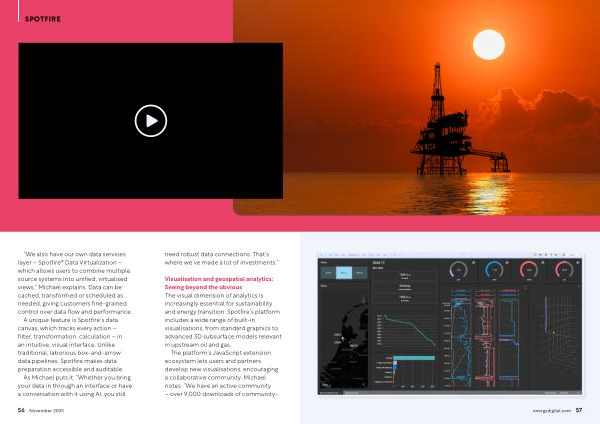 Visualisation and geospatial analytics: Seeing beyond the obvious The visual dimension of analytics is increasingly essential for sustainability and energy transition. Spotfire’ s platform includes a wide range of built-in visualisations, from standard graphics to advanced 3D subsurface models relevant in upstream oil and gas.