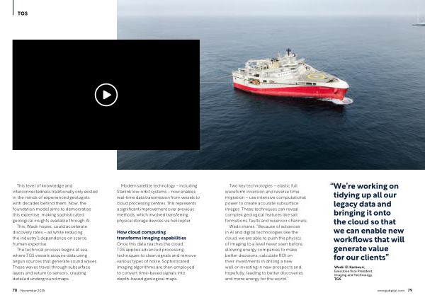The technical process begins at sea, where TGS vessels acquire data using airgun sources that generate sound waves. These waves travel through subsurface layers and return to sensors, creating detailed underground maps.