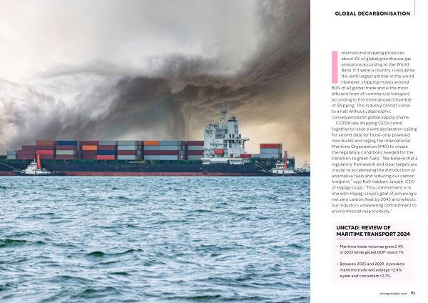 COP28 saw shipping CEOs come together to issue a joint declaration calling for an end date for fossil-only powered new builds and urging the International Maritime Organization( IMO) to create the regulatory conditions needed for the transition to green fuels.“ We believe that a regulatory framework and clear targets are crucial to accelerating the introduction of alternative fuels and reducing our carbon footprint,” says Rolf Habben Jansen, CEO of Hapag-Lloyd.“ This commitment is in line with Hapag-Lloyd’ s goal of achieving a net zero carbon fleet by 2045 and reflects our industry’ s unwavering commitment to environmental responsibility.”