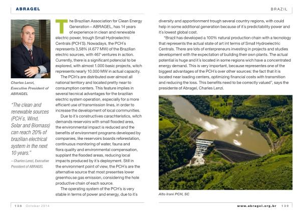 “ Brazil has developed a 100 % natural production chain with a tecnology that represents the actual state of art int terms of Small Hydroelectric Centrals . There are lots of enterpreneurs investing in projects and studies development with the expectation of building their own plants . The actual potential is huge and it ´ s located in some regions wich have a concentrated energy demand . This is very important , because representes one of the biggest advantages of the PCH ´ s over other sources : the fact that it is located near loading centers , optimizing financial costs with transmition and reducing the loss . This benefits need to be correctly valued ”, says the presidente of Abragel , Charles Lenzi .