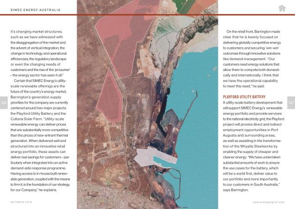 Certain that SIMEC Energy ’ s utilityscale renewable offerings are the future of the country ’ s energy market , Barrington ’ s generation supply priorities for the company are currently centered around two major projects : the Playford Utility Battery and the Cultana Solar Farm . “ Utility-scale renewable energy can deliver prices that are substantially more competitive than the prices of new-entrant thermal generation . When delivered well and structured into an innovative retail energy portfolio , these assets can deliver real savings for customers – particularly when integrated into an active demand-side response programme . Having access to in-house built renewable generation , coupled with the means to firm it , is the foundation of our strategy for our Company ,” he explains .