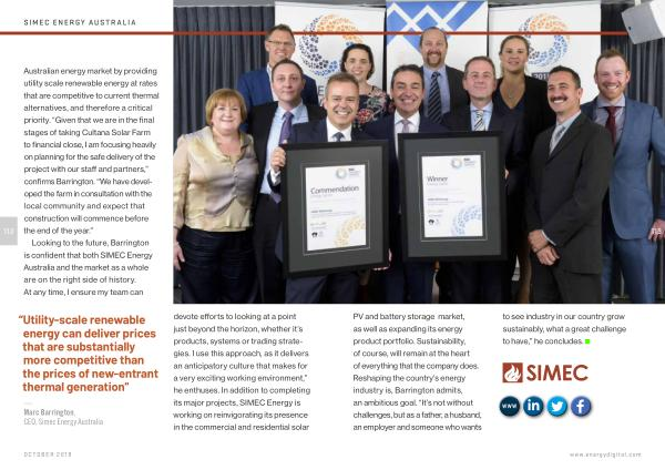 — Marc Barrington , CEO , Simec Energy Australia devote efforts to looking at a point just beyond the horizon , whether it ’ s products , systems or trading strategies . I use this approach , as it delivers an anticipatory culture that makes for a very exciting working environment ,” he enthuses . In addition to completing its major projects , SIMEC Energy is working on reinvigorating its presence in the commercial and residential solar
