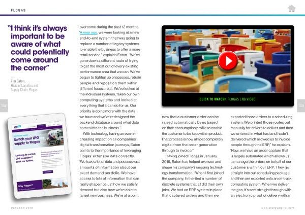 — Tim Eaton , Head of Logistics and Supply Chain , Flogas overcome during the past 12 months . “ A year ago , we were looking at a new end-to-end system that was going to replace a number of legacy systems to enable the business to offer a more retail service ,” explains Eaton . “ We ’ ve gone down a different route of trying to get the most out of every existing performance area that we can . We ’ ve begun to tighten up processes , retrain people and reposition them within different focus areas . We ’ ve looked at the individual systems , taken our own computing systems and looked at everything that it can do for us . Our priority is doing more with the data we have and we ’ ve redesigned the backend database around what data comes into the business .”
