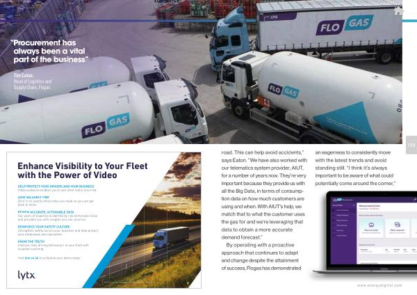 road . This can help avoid accidents ,” says Eaton . “ We have also worked with our telematics system provider , AIUT , for a number of years now . They ’ re very important because they provide us with all the Big Data , in terms of consumption data on how much customers are using and when . With AIUT ’ s help , we match that to what the customer uses the gas for and we ’ re leveraging that data to obtain a more accurate demand forecast .”