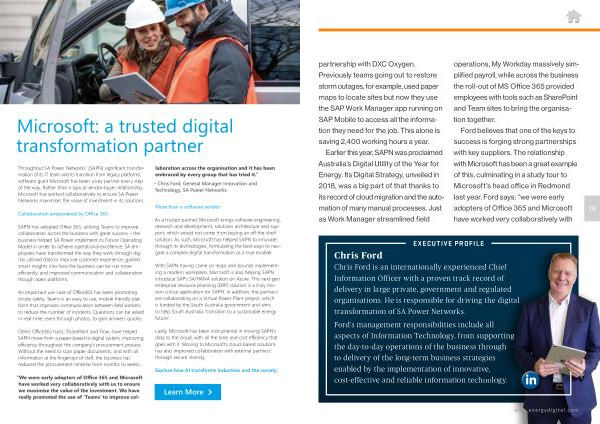 SAPN has adopted Office 365 , utilising Teams to improve collaboration across the business with great success – the business helped SA Power implement its Future Operating Model in order to achieve operational excellence . SA employees have transformed the way they work through digital , utilised data to improve customer experience , gained smart insights into how the business can be run more efficiently , and improved communication and collaboration though open platforms .
