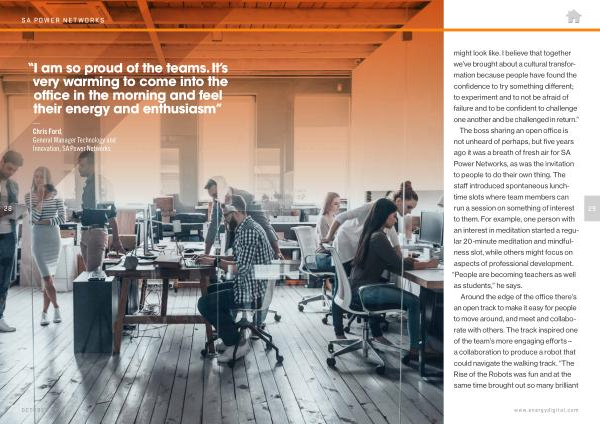 might look like . I believe that together we ’ ve brought about a cultural transformation because people have found the confidence to try something different ; to experiment and to not be afraid of failure and to be confident to challenge one another and be challenged in return .” The boss sharing an open office is not unheard of perhaps , but five years ago it was a breath of fresh air for SA Power Networks , as was the invitation to people to do their own thing . The staff introduced spontaneous lunchtime slots where team members can run a session on something of interest to them . For example , one person with an interest in meditation started a regular 20-minute meditation and mindfulness slot , while others might focus on aspects of professional development . “ People are becoming teachers as well as students ,” he says .