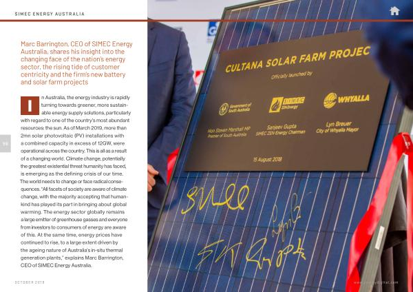 I n Australia , the energy industry is rapidly turning towards greener , more sustainable energy supply solutions , particularly with regard to one of the country ’ s most abundant resources : the sun . As of March 2019 , more than 2mn solar photovoltaic ( PV ) installations with a combined capacity in excess of 12GW , were operational across the country . This is all as a result of a changing world . Climate change , potentially the greatest existential threat humanity has faced , is emerging as the defining crisis of our time . The world needs to change or face radical consequences . “ All facets of society are aware of climate change , with the majority accepting that humankind has played its part in bringing about global warming . The energy sector globally remains a large emitter of greenhouse gasses and everyone from investors to consumers of energy are aware of this . At the same time , energy prices have continued to rise , to a large extent driven by the ageing nature of Australia ’ s in-situ thermal generation plants ,” explains Marc Barrington , CEO of SIMEC Energy Australia .