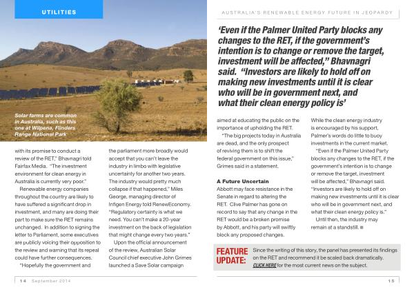 Renewable energy companies throughout the country are likely to have suffered a significant drop in investment , and many are doing their part to make sure the RET remains unchanged . In addition to signing the letter to Parliament , some executives are publicly voicing their opposition to the review and warning that its repeal could have further consequences .
