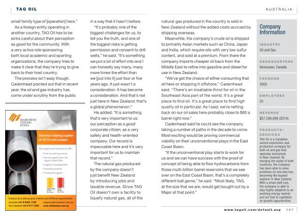 small family type of [ operation ] here .” As a foreign entity operating in another country , TAG Oil has to be extra careful about their perception as good for the community . With a very active role sponsoring both local academic and sporting organizations , the company tries to make it clear that they ’ re trying to give back to their host country .