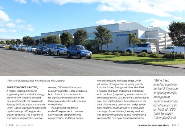 ENERGYWORKS LIMITED , A market leading provider of engineering solutions to the energy sector in New Zealand , secured new investment to the business in January 2014 . As a new shareholder , Direct Capital is providing additional capital to support Energyworks ’ growth initiatives . The investment was made alongside the existing owners , CEO Allen Clarke , and Executive Director Dallas Chadwick , both of whom who continue to be significant shareholders in the Company and continue to manage the business .