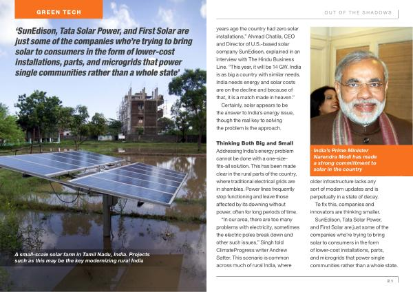 Out of the Shadows years ago the country had zero solar installations ,” Ahmad Chatila , CEO and Director of U . S . -based solar company SunEdison , explained in an interview with The Hindu Business Line . “ This year , it will be 14 GW . India is as big a country with similar needs . India needs energy and solar costs are on the decline and because of that , it is a match made in heaven .” Certainly , solar appears to be the answer to India ’ s energy issue , though the real key to solving the problem is the approach .