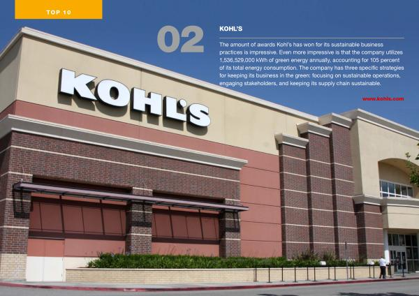The amount of awards Kohl ’ s has won for its sustainable business practices is impressive . Even more impressive is that the company utilizes 1,536,529,000 kWh of green energy annually , accounting for 105 percent of its total energy consumption . The company has three specific strategies for keeping its business in the green : focusing on sustainable operations , engaging stakeholders , and keeping its supply chain sustainable .